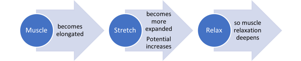 The muscle becomes elongated.  The stretch becomes more expanded = The stretch potential increases, so muscle relaxation deepens.